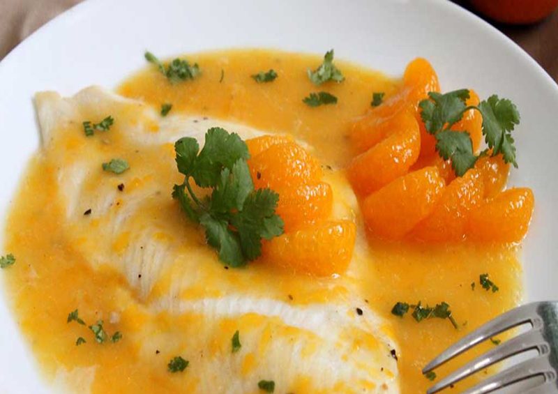 Despeje em uma Panela o caldo de peixe, o vinho branco e deixe ferver por alguns minutos. Misture a manteiga e o suco deixando reduzir. Adicione os gomos cortados ao meio, reserve alguns inteiros para decoração do prato ( retirar as sementes e partes brancas ). Deixa ferver por mais uns 3 minutos e tempere com sal e pimenta e o molho inglês.